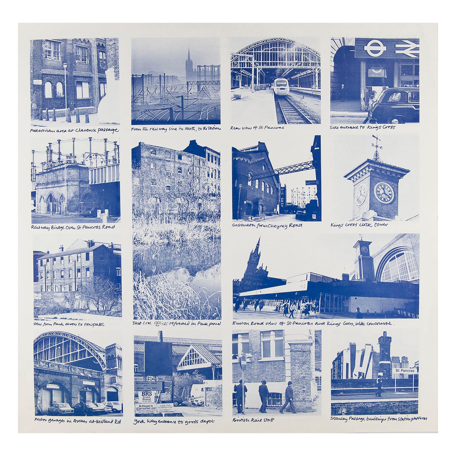 A pair of double-sided photographic collages by designer and photographer Jessica Strang (1938–2021) documenting everyday scenes in the vicinity of Kings Cross and St Pancras railway stations, 1987. A really remarkable set of evocative images, ranging from joggers pounding the canal towpath to unflinching views of post-industrial decline, long before the area was refurbished. A higher resolution image is available for viewing on request.